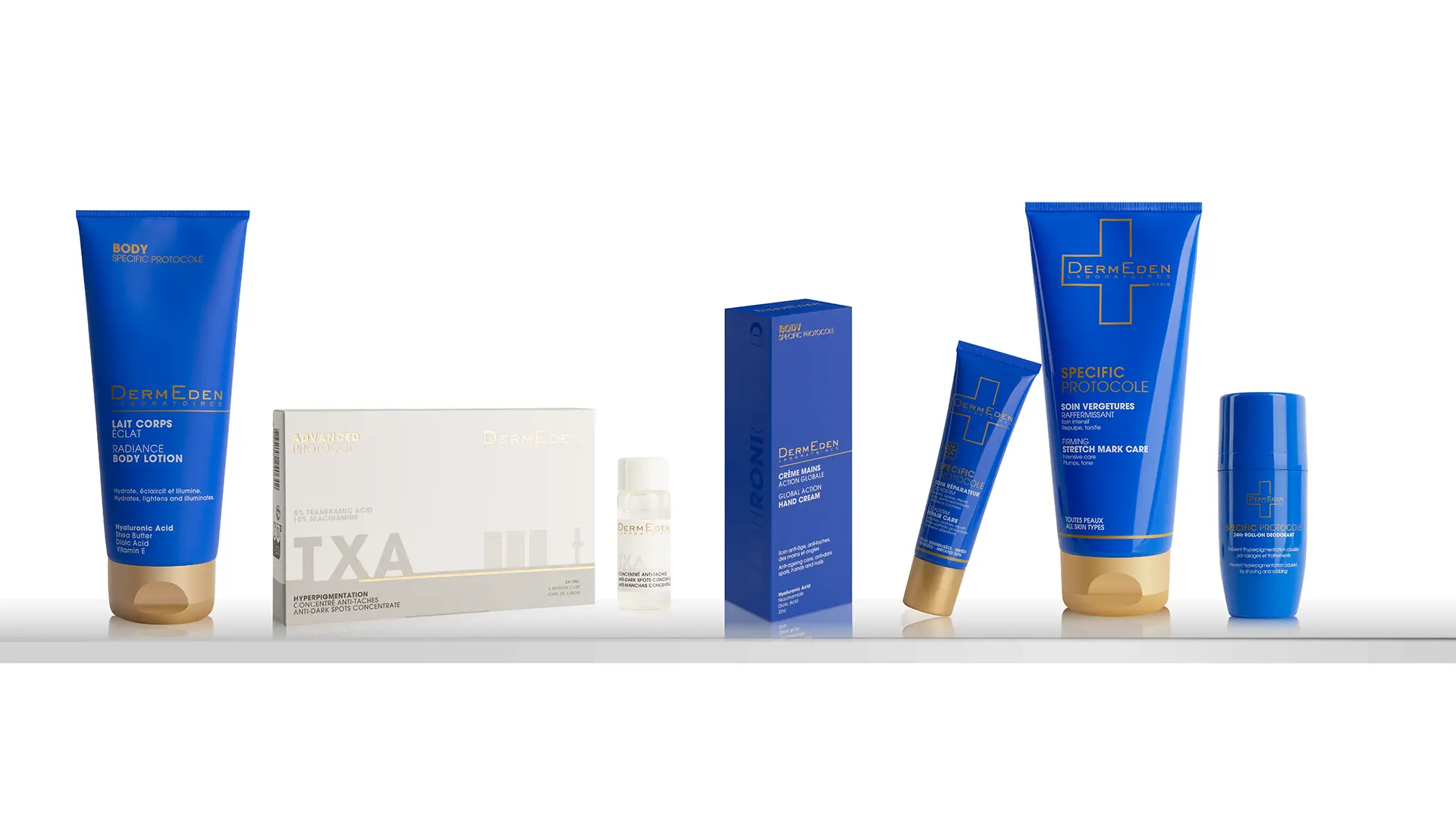 “DermEden” naudoja tik mokslo bendruomenės pripažintas molekules, kurios dažniausiai taikomos lazerio procedūrų, cheminių šveitimų ar mikro-adatinių terapijų metu: traneksamo rūgštis, retinolis (inkapsuliuotas), niacinamidas (Grade S), glikolio rūgštis, hialurono rūgštis, dioinė rūgštis.